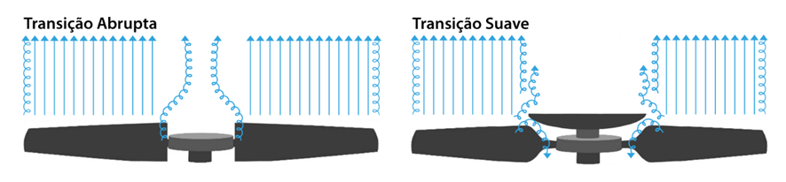 Nota-se que na primeira figura a transição entre a pá e o cubo é feita de forma abrupta, resultando em melhores condições aerodinâmicas na região da raiz da pá. A segunda figura detalha uma transição suave que, apesar se ser estruturalmente mais conservadora, pode ocasionar problemas de recirculação aerodinâmica na região da raiz, e consequentemente, uma menor eficiência do ventilador.