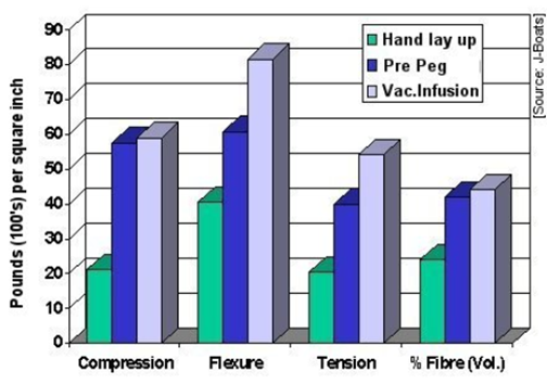 Figure 7 – Difference in mechanical properties and fiber percentage for different manufacturing processes.