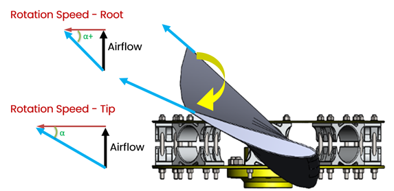 Figura 4: Ejemplo de torsión aerodinámica del aspa para compensar la diferencia de velocidades entre la raíz y la punta